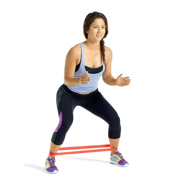 Tímto cvikem posilujete zadek, boky a stehna. Postavte se rovně s nohama od sebe na šířku boků. Gumu si umístěte těsně nad kolena na stehna. Tlačte boky dozadu, potom udělejte dřep a kolena tlačte proti odporu posilovací gumy. Udělejte pauzu a pak se pomalu vraťte do výchozí polohy. Opakujte 15–20×.