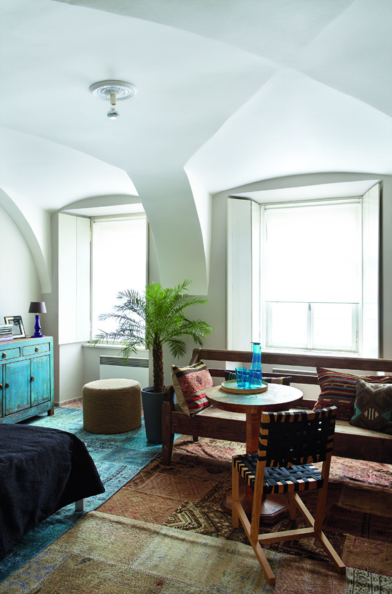 „Filip v pokoji postrádal i úložné a odkládací plochy, svítidlo a doplňky navozující teplo,“ říká designérka Janka Murínová. „V ložnici byla postel, skříň i zajímavý stolek, ale příjemný pocit navozovala jen vzrostlá palma,“ doplňuje Janka. Pokoj tedy nechala vymalovat, přičemž výklenky jsou natřené jemným odstínem šedé – díky tomu vyniká bílá stropní klenba. Polystyrenová rozeta je dokonalou iluzí štukové výzdoby, která do stylového pokoje patří a tvoří zajímavý přechod mezi stropem a osvětlením. Místo nevyužitého psacího stolu Janka vybrala komodu s patinou a posezení u šachového stolku rozšířila o zahradní lavici z masivního kusu dřeva. Pro větší pohodlí jsou na ní polštáře. Hodí se k látkovým výpletům nových židlí i ke kobercům, které jsou zčásti umístěné přes sebe.