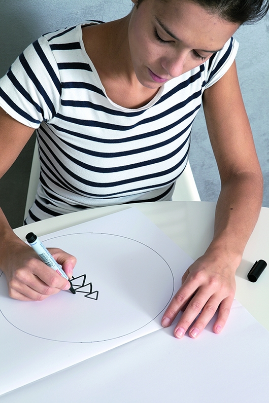 Nejdříve si zkuste nakreslit několik vzorů. Designérka Andrea Beranová zvolila kombinace drobných teček a hvězdiček, z nichž složila také hlavní motiv uprostřed každého talíře.