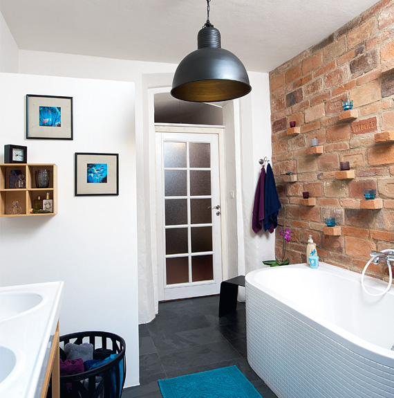 „Dlažba z přírodní břidlice v nás vyvolává dojem, jako bychom chodili po sluncem vyhřátých skalách,“ dodává ještě Honza. I když se prostor zmenšil, rodina teď má větší luxus – nejen že je tu vana, ale hned u dveří se našlo zákoutí i pro sprchový kout, oddělený příčkou z ytongu, a vešel se sem i klozet. S rekonstrukcí koupelny se svezly i další prostory. Tím, že Honza koupelnu zmenšil pomocí cihlové stěny, vznikl v sousední chodbě končící oknem tak velký prostor, že se tu najednou dal vybudovat pokoj pro staršího syna. „Cihly kladené ve zdi kolmo přesahují jak do koupelny, tak do dětského pokoje, a David si na výstupky taky vystavuje své oblíbené objekty, máme tak vlastně oboustrannou galerii,“ usmívá se Honza.
