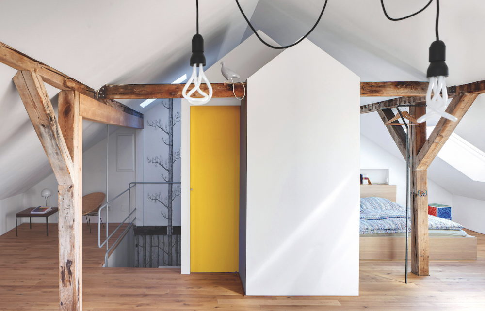 Podkroví nabízí krásný výhled a byt je plný vtipných detailů. Jako když nad oknem visí v závěsných květináčích vzhůru nohama kaktusy.