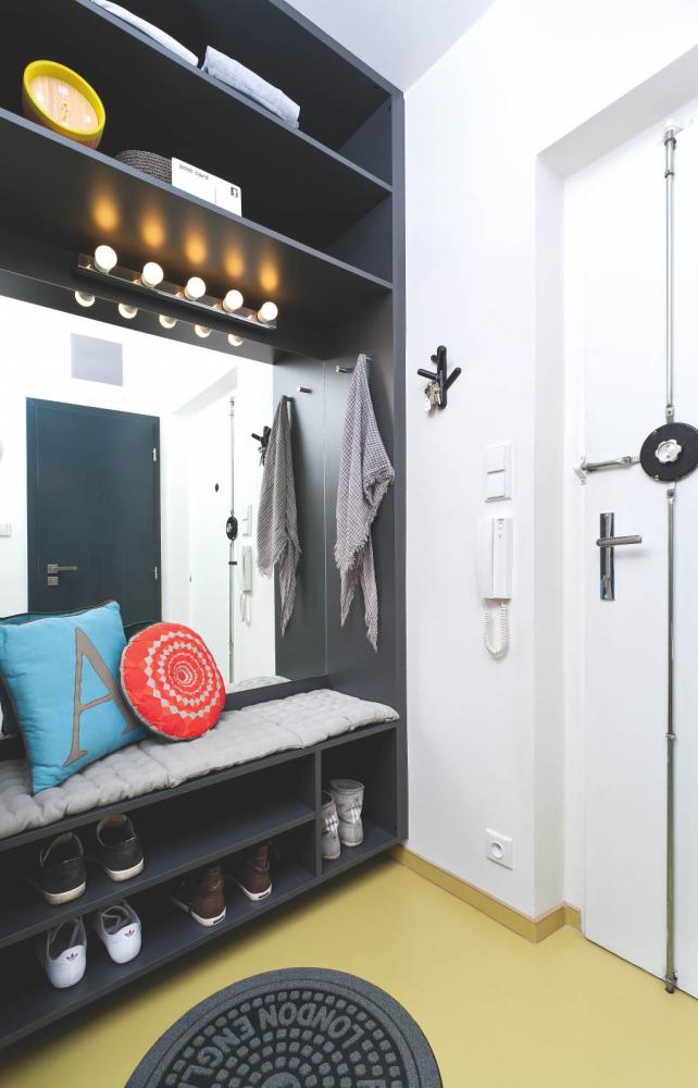 Tomáš Strnad bydlí se svou přítelkyní v malém panelovém byte na pražských Petřinách, kam se přistěhovali před více než půl rokem. Od začátku je trápil nedostatek úložného prostoru, a tak vše končilo v předsíni – mycí a úklidové prostředky, krabice, vysavač, zkrátka cokoli, co nechtěli mít v ložnici a v obýváku. Za čas tato místnost připomínala spíše skladiště a s tím se muselo začít něco dělat. Tomáš si přivzal na pomoc designerku Lenku Halváčovou, která mu doporučila skříň na míru. „Velice nás limitovala příčka se vzduchotechnikou, kterou nešlo zbourat. Nechali jsme ji zakrýt panelem, který společně se skříněmi vytváří jeden blok. Do té stěny skříně, která na schovanou vzduchotechniku navazuje, jsme nechali vyříznout otvor s mřížkou, kterou proudí chladný vzduch ze šachty. Můžou tu být tedy uskladněné potraviny,“ říká Lenka. Největší radost Tomášovi udělaly boxy na tříděné prádlo. „Jsem rád, že už nám nestraší prádlo v obýváku. Teď je schované, a ještě ho můžu rovnou rozdělit,“ pochvaluje si Tomáš. Místem na odkládání tašek a bund se stal na míru vyrobený botník s policemi a zrcadlem, jež prostor opticky zvětšilo. Přání majitele, aby interiér nepůsobil jako typicky panelákový, vyřešila Lenka dřevěným obkladem, který pokračuje až do vedlejší místnosti. Byt tak získal osobitý vzhled připomínající venkovskou dřevostavbu.