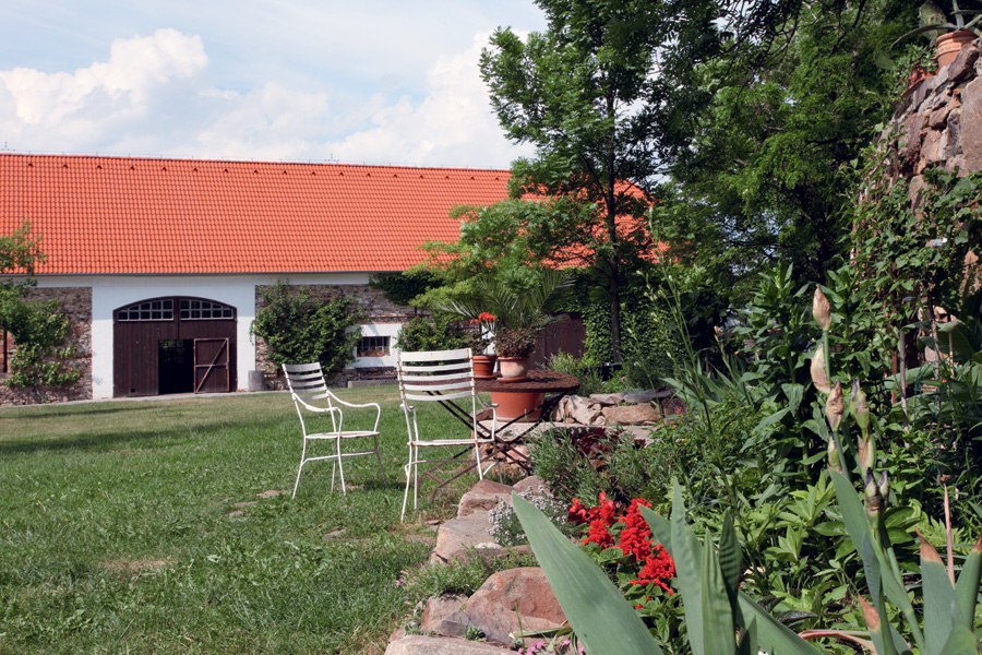 Stádo čtyř koní už má svoje nároky, protože třeba jen na uskladnění slámy padne celá stodola, kolem které musí být prostor na přístup mechanizace. Nicméně nejpozoruhodnější část zahrady se nachází právě mezi obytným domem a stodolou. Je tu podivuhodný mix druhů, od různých kaktusů přes mnoho trvalek až po dvě meruňky nebo vinnou révu pnoucí se u kamenné stěny stodoly. Nesourodá směs ale působí přirozeně a harmonicky. Věrně odráží zahradnickou filozofii Ireny: žít i nechat žít a s péčí to nepřehánět.