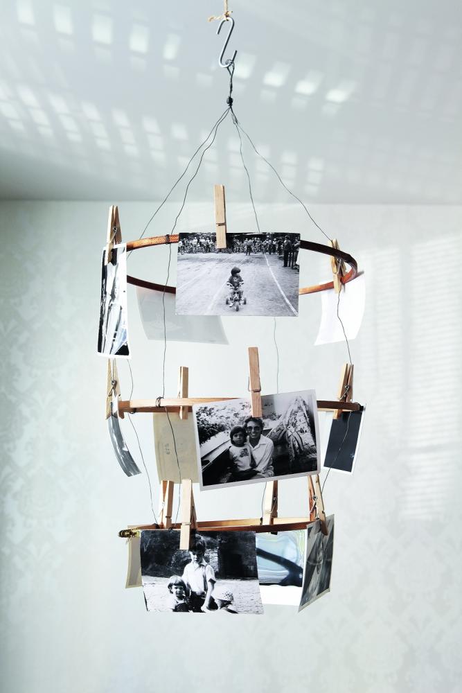 4. Pomocí kolíčku na prádlo připevněte k obruči fotografie. Na závěr očkem stínidla protáhněte kabel s objímkou a žárovkou a zavěste.
