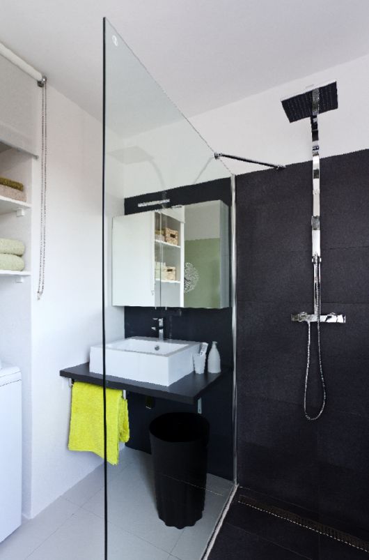 „Když vlastníte rodinný dům, máte v něm pořád co dělat. My ten náš předěláváme už skoro dvacet let,“ říká Eva Kurelová. „Koupelnu bychom možná vůbec neřešili, kdyby v ní nepřestala téct voda. S manželem jsme si tedy nakonec řekli, že když už se tu má jednou vrtat, tak proč rovnou nepředělat celou koupelnu, která se nám stejně zdála nemoderní a na stáří nepraktická.“ Naše kouzelnice přes koupelny Lenka Hlaváčová dostala na začátek dva hlavní úkoly – místo vany umístit sprchový kout a vytvořit úložný prostor, kam by se schovala i pračka. Přestože je koupelna poměrně úzká, a navíc rozdělená komínem, designérka přišla s několika řešeními. Jedním z nich bylo záchod úplně oddělit a zpřístupnit z chodby. Aby se pak ale člověk dostal do koupelny, musel by komplikovaně projít úzkou chodbičkou a to prostoru příliš nelichotilo. Zvítězila tedy varianta nechat záchod a koupelnu v jedné místnosti. I pro tu měla Lenka více variant. Například umístit sprchový kout tam, kde je teď WC, a to přesunout vedle umyvadla. Tím by se u okna vytvořil větší prostor a vešel by se tam i bidet. Majitelka však chtěla raději záchod oddělený od ostatního vybavení koupelny, aby poskytoval alespoň částečné soukromí. To Lenka ještě umocnila postavením zděné příčky napojené na zeď s komínem. Tím vytvořila zónu záchodu a zónu koupelny. Příčka navíc v zóně koupelny tvoří niku, do níž je umístěna pračka a police. Vanu vystřídal sprchový kout a plovoucí podlahu velkoformátové bílé dlaždice. Staré obkladačky šly tak nemilosrdně pryč a místo nich malíř použil na stěny omyvatelný nátěr.