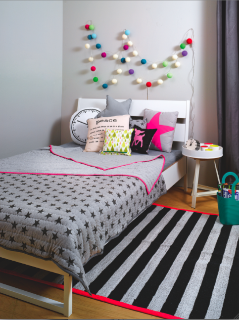 - šedý bavlněný přehoz s hvězdičkami, 130 × 170 cm, 3369 Kč, šedý bavlněný přehoz s fluo proužkem Neon Pink, 130 × 180 cm, 3184 Kč, pruhovaný černobílý koberec Neon Pink, 3369 Kč, vše www.bellarose.cz