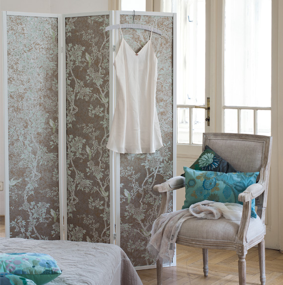 Tapeta pod sklem Bohéme, 1300 Kč/role, www.inframe.cz; tapety na zemi: kolekce Fornasetti, Il Sole, Cole & Son, www.color-design.cz, 3680 Kč/ role10 m × 52 cm; Soul, www.inframe.cz, 1440 Kč/role; páskové boty Blink, Debenhams, 549 Kč; polštář s rozkvetlými větvičkami, Apropos, 585 Kč; polštář s vyšitými barevnými květy, Interiér de l’Art, 990 Kč (viz obr. 1)