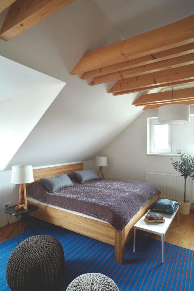 Manželé Jitka a Martin Chomovi ještě před čtyřmi lety žili v bytě na jednom z pražských sídlišť. Vzhledem k tomu, že byl dům bez výtahu a paní Jitka začala mít zdravotní problémy, rozhodli se, že si kousek za Prahou postaví rodinný dům. Vzhledem k tomu, že jsou oba velmi pracovně vytížení, nechali si od naší designérky Zuzany Bernasovské poradit s vybavením a uspořádáním ložnice, kterou bylo ze všech místností třeba zařídit nejrychleji. Požadavkem manželů Chomových byl nábytek z masivního dřeva. „Nejprve jsme do ložnice chtěli skříň, ale záhy jsme si uvědomili, že by byla pro tento podkrovní prostor příliš mohutná. Zuzana přišla s nápadem nechat na míru vyrobit dvě komody z dubového dřeva a to se nám zdálo být nejlepší variantou. Také se nám líbí jejich čistý design. Už se těším, až si do nich nastěhuju ložní prádlo,“ pochvaluje si paní Jitka. Dalším požadavkem manželů byla postel – také z dubového dřeva. Obojí příjemně ladí s dubovou podlahou a trámy. Aby ložnice kvůli přemíře dřevěných prvků nepůsobila příliš unaveným dojmem, Zuzana ji oživila barevným kobercem, oranžovou lampou a květinami. Nad komodu pověsila fotografie s detailem květu, které masiv zjemnily. Paní Jitka měla největší radost ze čtecího koutku. Tvoří ho lampa, odkládací stolek na kávu a pohodlné křeslo v šedé neutrální barvě. „Křeslo jsme dovezli z Ikea. Je to replika modelu z roku 1958. Posezení v něm je zážitek. Skoro máte pocit, že vás objímá,“ říká designérka Zuzana.