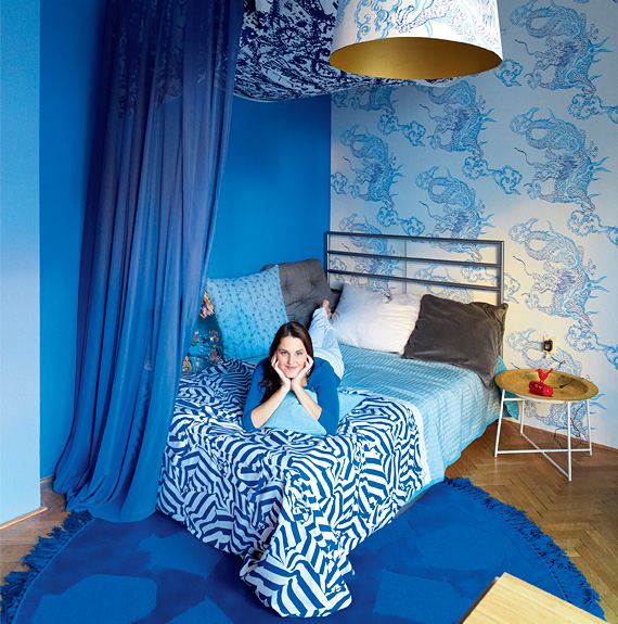 „Gábina mi vyprávěla svoje zážitky z cest, viděla jsem, že jí to chybí, a tak jsem pokoj stylizovala tak, aby se po příchodu z kanceláře domů v myšlenkách přenesla do krajin, kde měla krásný pocit,“ říká Zuzana. „Za základ jsem zvolila modrobílou kombinaci. V ní jsou laděné látky s výraznými vzory, tapeta je plná čínských draků, na zem jsem dala koberec, který vypadá jako ošoupaná džínovina a také evokuje vodu. Jako kontrastní akcent jsem zvolila zlatou, která současně vnáší pocit luxusu. Zrcadlo má zlatý rám a zlatá je také uvnitř lustru a na stolku. Hlavní efekt vytvářejí kvalitní krásné látky. U nich jsme si dovolili vyšší cenovou skupinu, protože nábytek jsme pořídili velmi levně. Pomocí látek jsem z postele vytvořila příjemné doupě v orientálním stylu. Protože je tady vysoký strop, dala jsem nad postel baldachýn, od nějž lze spustit další látku k zemi, a uzavřít tak prostor postele. Krásný efekt dělá také záclonovina ve světle modré barvě. Skrze ni proniká do místnosti modré světlo a člověk se opravdu cítí jako pod mořskou hladinou. Všude se tu rozechvívá hluboká modrá, která dává pocit klidu a míru.“