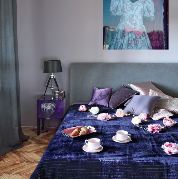 foto č. 1 – Fialový sametový prošívaný přehoz, 200 × 220 cm, AlmiDécor, 2270 Kč; vyšívaný polštář bavlněný Cream, 40 × 40 cm, 754 Kč, růžový zákrčník s bílými puntíky, 566 Kč, oba Apropos
