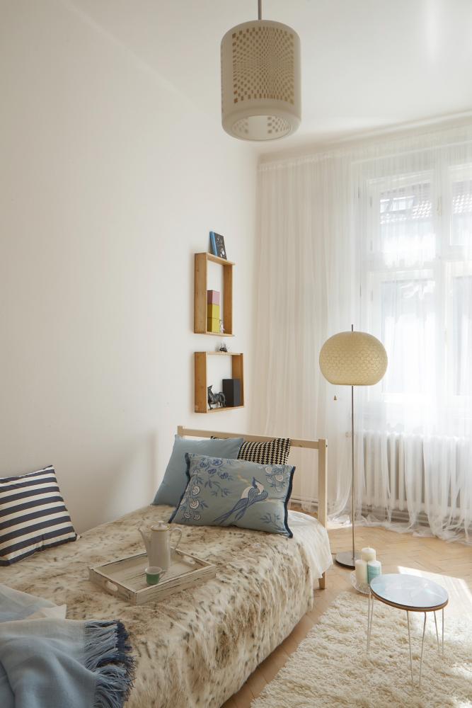 Viki si pro svůj pokoj ve společném pronájmu přála vzdušný styl bez zbytečných věcí a jednoduché zařízení – vytvoření ložnice, kde dobije energii nejen v noci, ae i přes den.