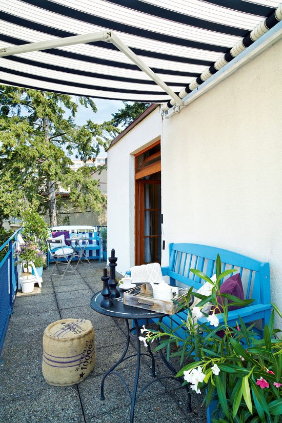 Na terasu jsme nainstalovali markýzu, která nejen zastíní okno a vstup do bytu, ale poskytne stín i pro sezení u stolku. Zdi jsme přetřeli bílou barvou, která odráží světlo, a tím brání přehřívání. Aby si terasu v hezkém počasí mohlo užít co nejvíce lidí, rozdělili jsme ji na dvě zóny s lavičkami. Vše jsme ladili do modré, fialové a bílé. Eva Jirotková tíhne k jednoduchým, ale pocitově příjemným doplňkům, a tak jsme zvolili oblíbený styl Provence.
