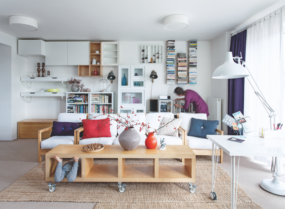 Tehdy společně vymyslely, jak pokoj s minimem nových kousků přeskládat tak, aby se z klasického obýváku stal menší kinosál pro rodinu i přátele. Stylově různé kusy nábytku sjednotilo světlé dřevo a v některých případech nový bílý nátěr, dvě policové knihovny, z nichž jedna v pokoji byla, Jana položila na zem, přimontovala kolečka a vyrobila z nich dva dlouhé stolky. Stejně tak využila původní skříňky a police.