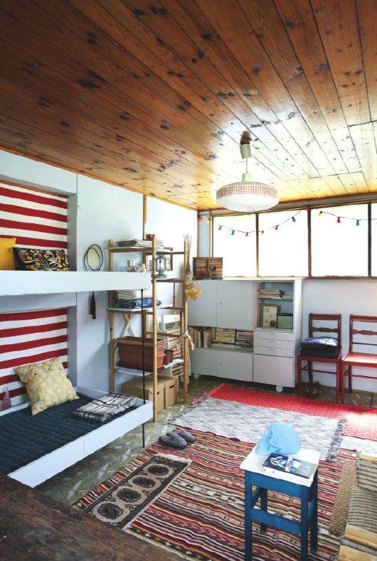 Aby se v domku člověk cítil skutečně jako doma, musely sem přijít i nějaké textilie. Chladnou stěnu za palandou designérka zakryla látkou, přidala pár nových polštářků a na zem rozložila několik kusových koberců. „Chtěla jsem, aby vynikl zajímavý vzor lina a menší koberce se daly snadno přemisťovat a vyklepávat. Ty nejenže místo příjemně zateplily, ale díky převládající červené a bordó barvě i rozveselily,“ říká Klára. Při proměně se muselo počítat s tím, že v domku bude neustálý pohyb, že se v něm bude pořád něco přesouvat, v létě schovávat nábytek ze zahrady a na podzim sušit květiny. Základem tedy bylo nechat prostor co nejvolnější. Na úplný závěr ještě Klára pověsila na okna barevné solární lampionky, které po setmění místnost krásně prozáří. Prázdniny plné dobrodružství mohou začít.