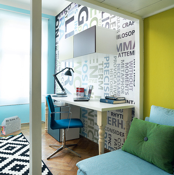 Na stěnu navrhla Zuzana tapetu s písmeny. „Nejde o text, dokonce ani o slova, která by měla smysl, je to písmo jako ornament, grafický prvek v moderním, až reklamním stylu,“ vysvětluje. „Má dramatickou působivost a elektrizující účinek. Nečekaně graficky s tapetou skvěle spolupracuje i laťové zábradlí vestavěného patra – a to právě proto, že je natřené nabílo. Pro písmena na bílém pozadí jsem kromě černé zvolila svěží pastelově žlutozelenou a modrou barvu, která patří k mládí. Tu jsem pak použila i na stěnách a jiných věcech v bytě. Efekt písmen na tapetě jsem posílila volbou výrazných koberců v černobílé kombinaci grafických vzorů. A skutečností, že tu bydlí mladý muž, jsem se dala vést při výběru doplňků, jako jsou technické tvary lamp, plechovky s Warholovým designem, nebo rohože instalované na stěnu za postelí. Ano, jsou to rohože, které se dávají na podlahu před dveře – a jak ozvláštnily prázdný prostor u postele! Současně poslouží jako praktická ochrana zdi, když se chce člověk opřít.“