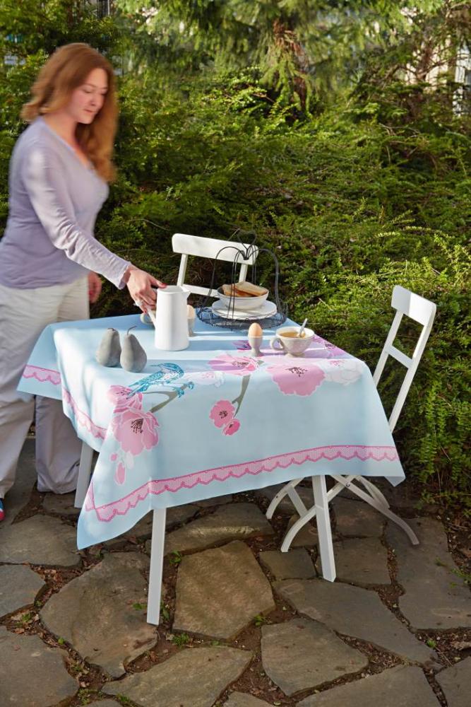 „Záměrně jsem se rozhodla pro prvoplánově romantický vzor a ještě ubrus vyzdobila natištěným krajkovým lemem. Myslím si totiž, že spousta z nás je v hloubi duše velmi romantická a miluje jednoduché, idylické obrázky a dekorace, jen se to často stydí svému okolí přiznat. Přitom když hledáme něco, co nás má spolehlivě pohladit po duši, tak první, po čem sáhneme, jsou květované vzory a ptáčci! Ostatně, na zahradu přece přirozeně patří, ne?“
