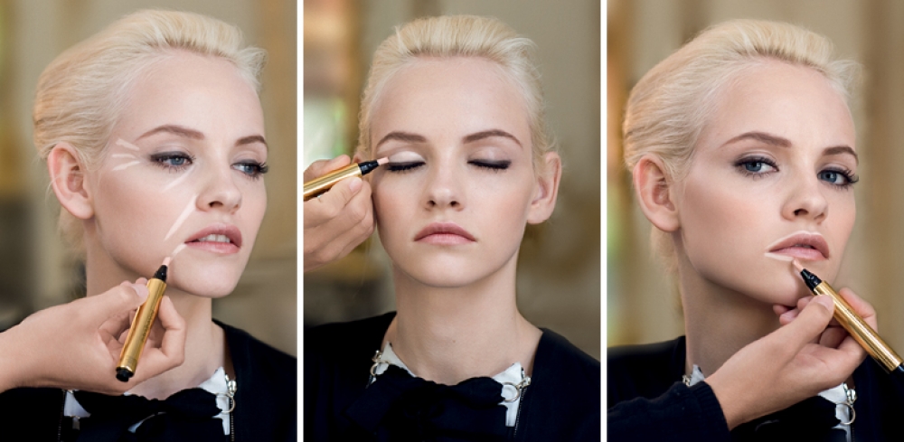Tmavá místa na tváři dodávají unavený vzhled. Proto je nutné tato místa projasnit – zejména prohlubně u vnitřních koutků očí, kruhy pod očima, chřípí nosu... tam všude naneste rozjasňovač. Ne však ten s obsahem perleti, ale takový, který opticky odráží světlo. Evergreenem je rozjasňovač v peru Touche Eclat od Yves Saint Laurent. Do koutků očí můžete použít pak při líčení očí také perleťový stín v odstínu slonové kosti nebo ivory. Skvělou zkušenost máme i s paletkami stínů od MAC.