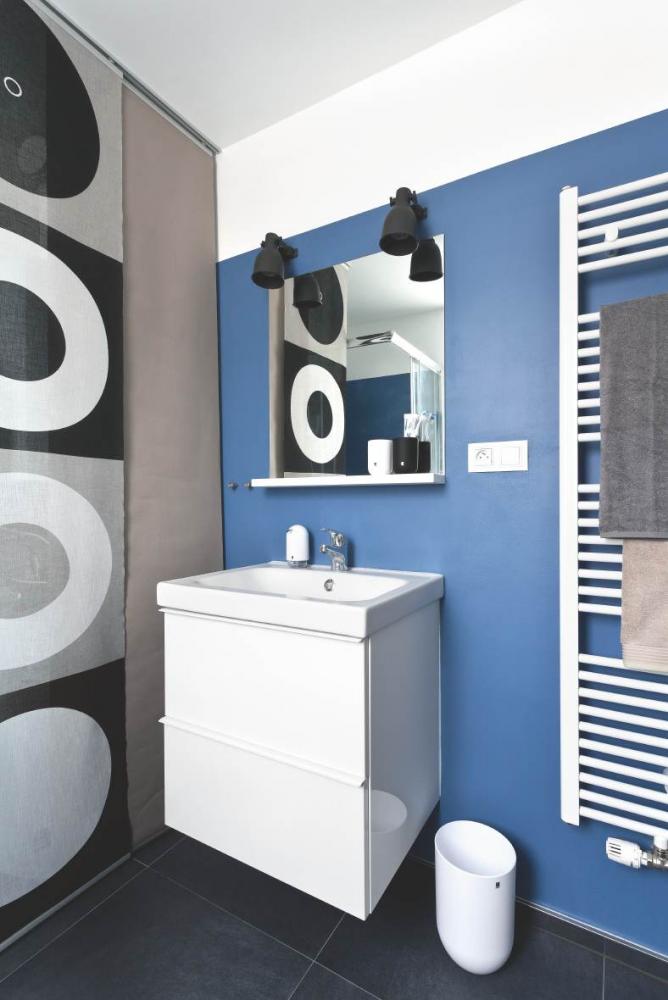 Nejprve se začalo s drobnými stavebními úpravami. Bylo třeba zrušit přizdívku s rozvody a vytvořit volný kout pro umístění bojleru a kotle. Staré zárubně a dveře byly nahrazeny jinými, protože byla položena nová podlaha se zabudovaným vytápěním. Lukáš chtěl velkoformátové kalibrované dlaždice v tmavě šedé barvě, protože nejsou náročné na úklid. „Podobnou představu jsem měl i o obkladech na stěny. Nejdřív mě napadlo použít klasické kachličky, chvíli jsem uvažoval i o vinylové tapetě, ale pak mi Lenka navrhla omyvatelný nátěr. V tu chvíli to pro mě byla ta nejjednodušší a zároveň nejlevnější varianta." Kluci mají rádi modrou a Lukáš jakbysmet. Modrá zeď ladí s tmavě šedou dlažbou a Lenka to doladila doplňky v bílé, černé, šedé a béžové barvě. Bojler a kotel diskrétně schovaly panelové závěsy. Jejich geometrický vzor dodal prostoru moderní nádech a šarm.