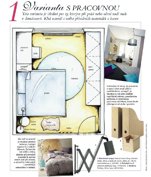 Pracovní stůl v ložnici umístěte k oknu, kde na něj bude dopadat nejvíce světla. Připravte si u něj také dost úložných prostorů – boxů se zásuvkami, skříněk či poliček –, abyste měli po ruce vše, co je třeba k práci. Chcete-li postel od pracovní zóny pocitově více oddělit, můžete ji v případě ložnice na našem plánku umístit ke stěně naproti oknu.