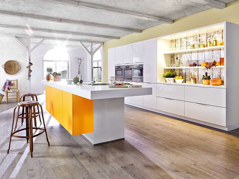 Bílý lesklý kuchyňský nábytek prosvětlí každý prostor. Kuchyně z prémiové třídy Livanza sestává z bílých skříněk ve vysokém lesku Stevia, doplněných o o mangově žlutou partii z linie Camelia. (ORESI)