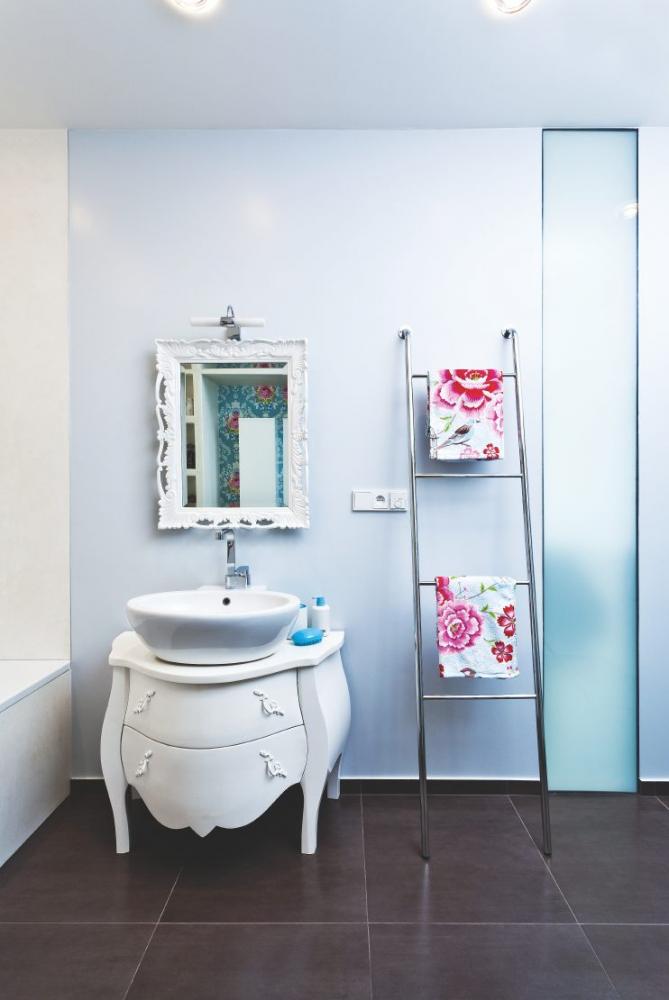 - Základní zařízení koupelny je minimalistické. Kompozice místnosti je řešena ucelenými barevnými a tvarovými bloky. To, co vytváří její romantický charakter, jsou dekorativní detaily – bílá dřevěná skříňka inspirovaná starofrancouzským nábytkem, zrcadlo s vyřezávaným rámem a bleděmodrá tapeta s růžovými květy pokrývající stěnu, ve které jsou nenápadně zabudovány dveře do šatny. Zdobné prvky, které koupelně dodávají nezaměnitelnou tvář, jsou přesně dávkovány tak, aby zůstaly oživením funkčního, moderního prostoru a nezahltily ho.