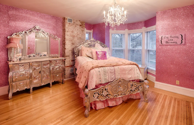 Uvnitř domu, který byl v roce 1883 postaven ve viktoriánském stylu, se nachází čtyři ložnice a sedm koupelen. Interiér je samozřejmě vyladěný v růžových barvách, nechybí ani třpytky nebo odstíny bledě modré. Zároveň je každá ložnice tematicky zařízená, a tak se návštěvníci mohou těšit na Královský pokoj, Princeznovský pokoj a Černou ložnici, ze které je výhled na velký bazén plný nafukovacích plameňáků.