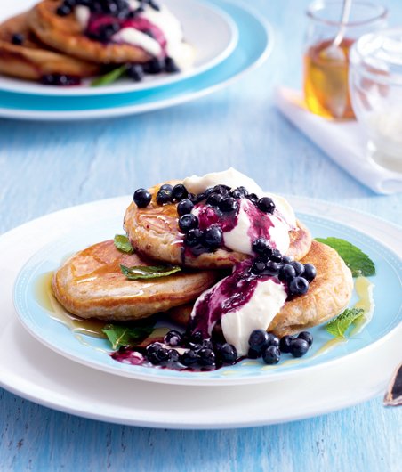 3. Rozdělte lívance na talíře, doplňte jogurtem prošlehaným s 1 lžící medu, zbývajícím medem lívance pokapejte a ozdobte je borůvkami a mátovými lístky.