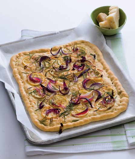 Zahřejte troubu na 220 °C a dejte do ní vyhřát alespoň na půl hodiny dva velké plechy. Těsto připravte podle základního receptu. Rozdělte ho na dvě části, které rozválíte na dva obdélníky asi o rozměrech 30 × 40 cm. Opatrně je přeneste na pečicí papír a přehnutím krajů vytvořte okraj pizzy. Na každý plát dejte sýr a na něj přibližně 12 přepůlených koleček citronu, nakonec cibuli. Posypte rozmarýnem, opepřete, zakapejte olejem. Pečte 10–15 minut dozlatova a dokřupava.