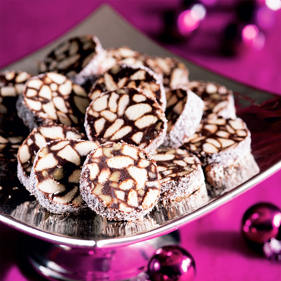 Z hmoty vyválejte silný váleček a obalte ho ve strouhaném kokosu. Zabalte do potravinářské fólie a dejte do druhého dne do chladničky odpočinout. Nakrájejte na plátky.