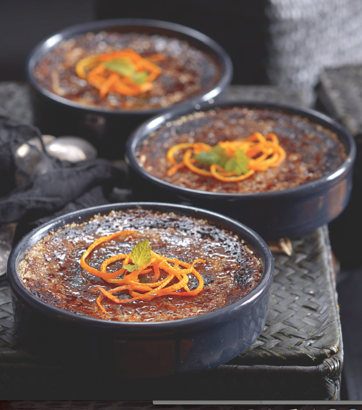 5) Před podáváním posypte každý krém dvěma lžičkami třtinového cukru. Ten je nutno zkaramelizovat – máte-li cukrářskou pistoli, je to výhoda, případně můžete použít pistoli horkovzdušnou, která se jinak používá na opalování oken, ale jde to i pod rozpáleným grilem. Jen tam zákusek nenechte déle, než je nutné, krém by se neměl zahřát. Jakmile je na povrchu krustička (trvá to 1–4 minuty), vyndejte, nechte vychladnout a dejte na hodinu odpočinout do lednice.