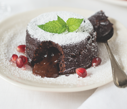 2) Kulaté malé zapékací formičky, tzv. kokotky (pokud nemáte, využijte třeba formičky na muffiny) vymažte máslem a vysypte kakaem. Naplňte je ze tří čtvrtin připravenou hmotou a pečte v troubě při 190 °C 9–12 minut, podle velikosti formičky – u těch muffinových stačí devět, kokotky potřebují dvanáct. Povrch fondantu se vám těsně před dopečením pěkně vyboulí, ale prostředek by měl zůstat tekutý. Když je upečeno, vyndejte fondanty z trouby, nechte je chvilku stát, než je budete (lehkým nadzvednutím nožem) vyprošťovat z formiček, připravte si kolem nich oblohu. Hotové dílo poprašte moučkovým cukrem – za prvé to skvěle vypadá, a za druhé zakryje případné tvarové nedokonalosti…