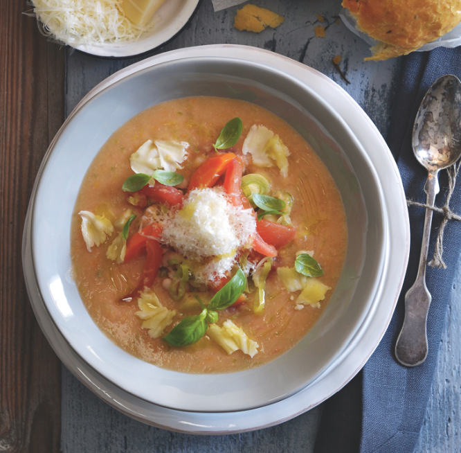 3) Asi třetinu polévky dejte do mixovací nádoby, rozmixujte, a pak ji vraťte zpět. Tím polévku zahustíte bez používání mouky. Podávejte se strouhaným parmazánem.