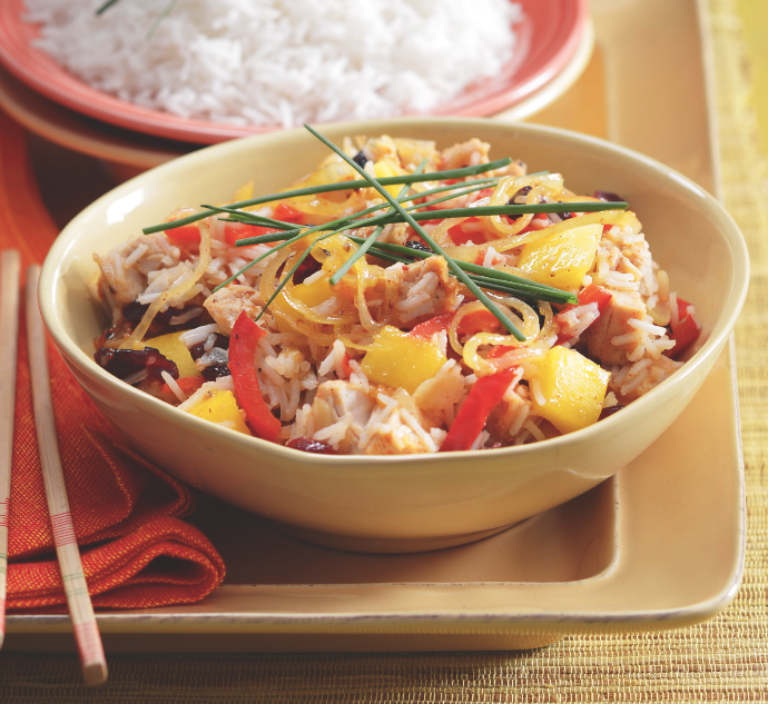 3) Když je rýže uvařená a slitá, přihřejte na pánvi masovoovocnou směs, lehce promíchejte s rýží a podávejte.