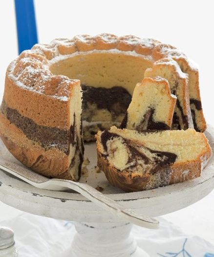 5. Formu vymažte máslem, vysypte hrubou moukou a vlijte do ní část světlého těsta, pak tmavé těsto a nakonec zbytek těsta světlého. Pečte asi 45 minut.