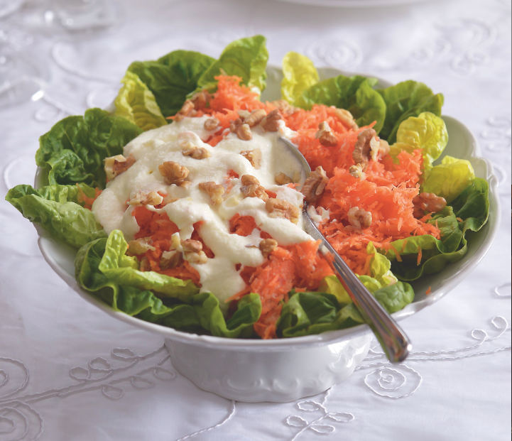 3) Podávejte po vzoru našich prababiček na míse, vyložené listy hlávkového salátu. Na závěr salát ozdobte vlašskými ořechy.