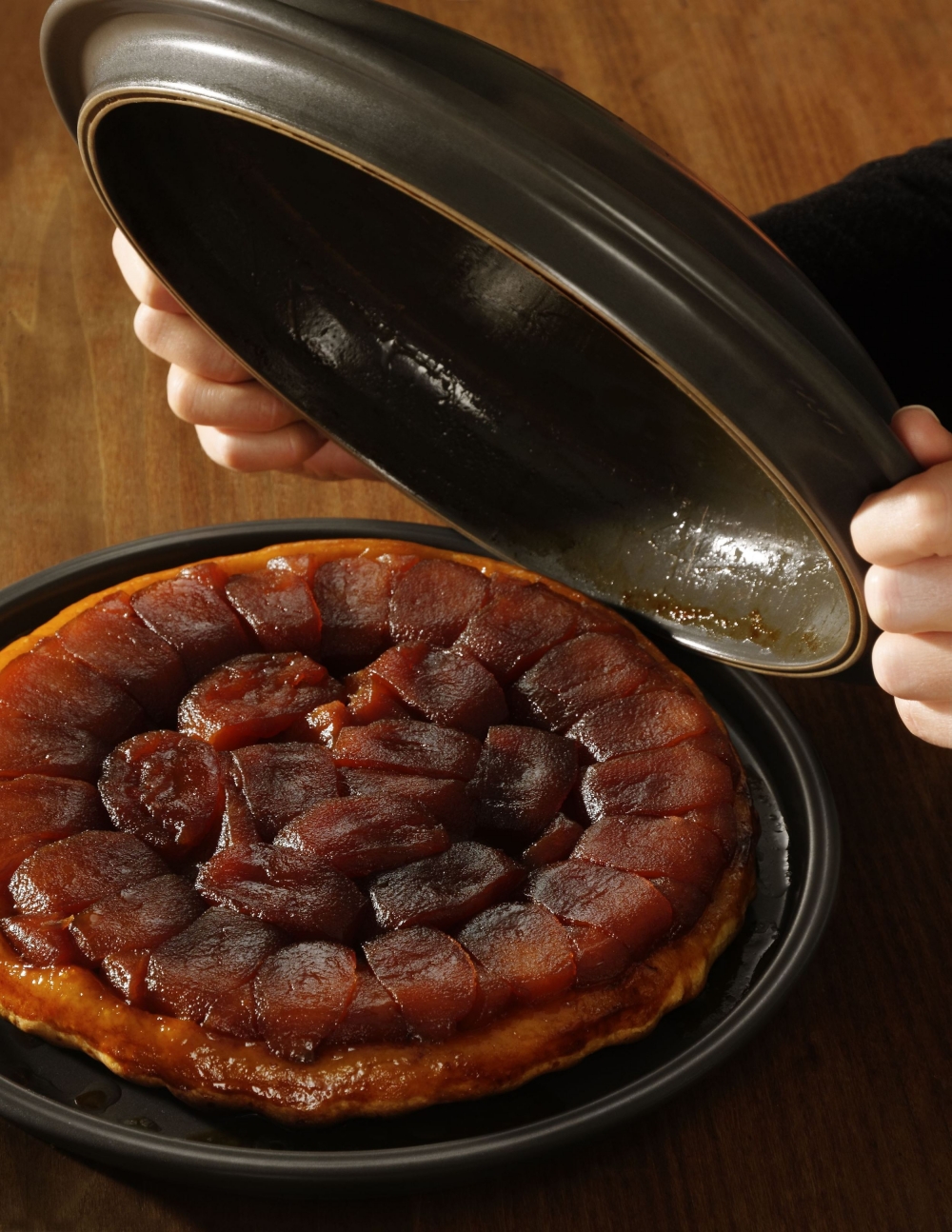 Nejlépe se koláč udělá v keramickém setu Tarte Tatin od francouzské značky Emile Henry, který umožní zvládnout všechny fáze přípravy za použití jediné nádoby. Karamel lze udělat přímo na sporáku, pak ve stejné formě pečeme koláč v troubě a po upečení překlopíme do druhé poloviny formy, sloužící zároveň jako talíř k servírování.