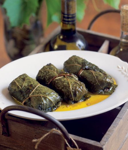 Vinné listy namočte do vroucí vody a nechte pět minut stát. Osmahněte na oleji v kastrolu cibulku a česnek. Do kastrolu přidejte maso a osmahněte. Osolte, opepřete a vmíchejte rajčata. Vše duste na mírném plameni pod pokličkou asi čtvrt hodiny. Podlévejte, jen je-li potřeba. Vychladlou směs promíchejte s uvařenou rýží.