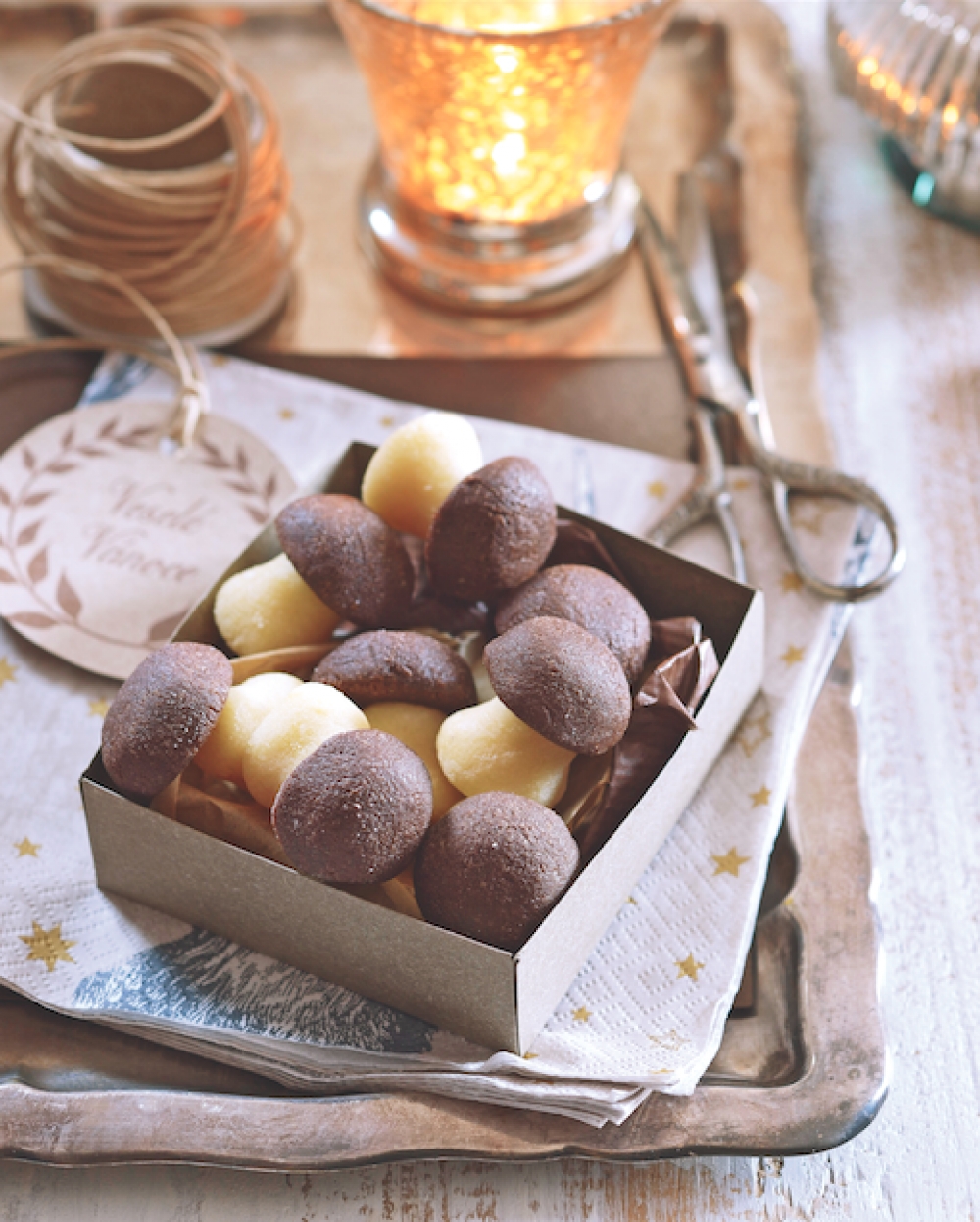 2. Zbylou třetinu těsta smíchejte s kakaem a vytvarujte kloboučky, na spodní straně by opět měly být ploché.