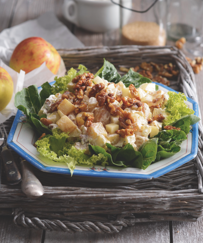 4) Promíchejte smetanu s majonézou, solí a pepřem. V míse smíchejte celer, ořechy (pár si jich nechte na ozdobení) a jablka a promíchejte se smetanovým dresinkem. Misky vyložte listy hlávkového salátu a na něj naaranžujte celerový salát. Ozdobte zbytkem karamelizovaných ořechů a dejte vychladit. Podávejte pěkně vychlazený.