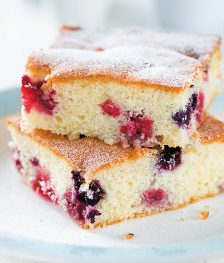Předehřejte troubu na 180 stupňů. Do mísy vyklepněte vejce, vsypte cukr a vyšlehejte do bílé pěny. Přisypte prosátou mouku s kypřicím práškem a špetkou soli, vlijte smetanu a promíchejte. Vyšší plech vymažte a vysypte moukou a vlijte na něj těsto. Posypte ovocem a pečte dorůžova; trvá to asi 25 minut. Zkontrolujte špejlí, zda těsto nelepí. Vyjměte z trouby a nechte vychladnout. Podávejte poprášené moučkovým cukrem s vanilkou.