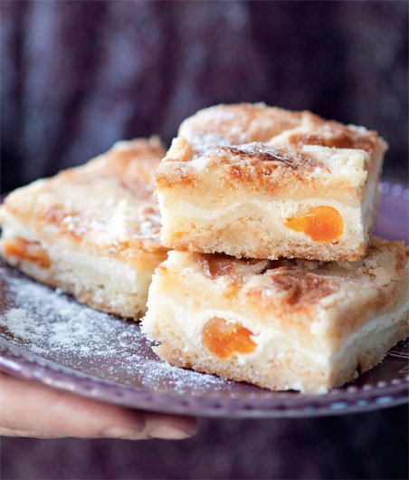 Předehřejte troubu na 180 °C. Na náplň prošlehejte tvaroh, vejce, oba cukry, citronovou kůru a tolik mléka, aby byl tvaroh jemný a řidší konzistence. Nakonec vmíchejte meruňky. Zvlášť smíchejte hrubou mouku, cukr a kypřicí prášek a směs rozdělte na polovinu.