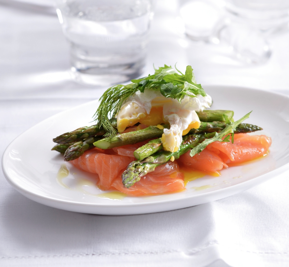 4) Na talíře s lososem naaranžujte chřest, na něj položte vajíčko, dozdobte bylinkami a podávejte.