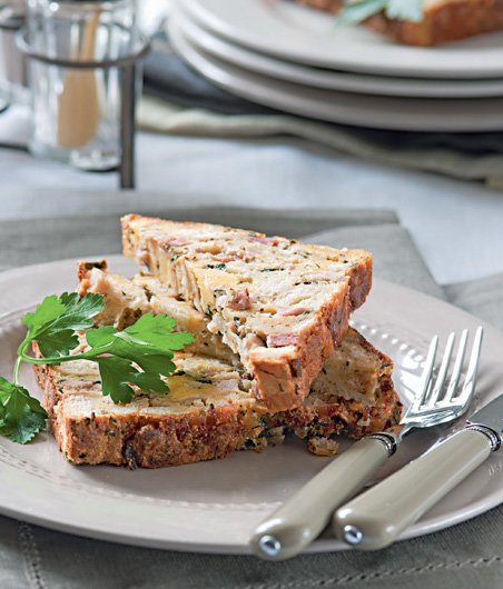 4 Připravenou směs přesuňte do vymazané chlebíčkové formy, povrch uhlaďte a pečte při 180°C asi 50 minut. Hotovou nádivku vyklopte a nakrájejte na plátky. Chutná teplá i zastudena.