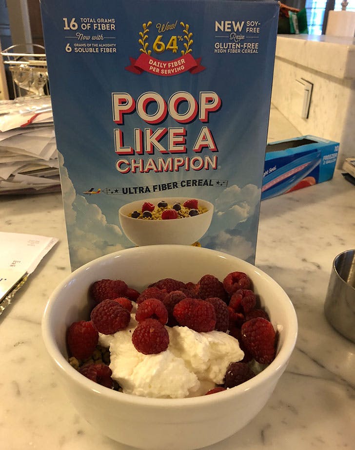 Snídá až po cvičení, ideálně bílý jogurt s malinami, stévií a cereáliemi. Její oblíbené jsou Poop Like a Champion High Fiber Cereal, které jsou velmi bohaté na vlákninu. Díky tomu vydrží Bobbi bez pocitu hladu až do oběda.