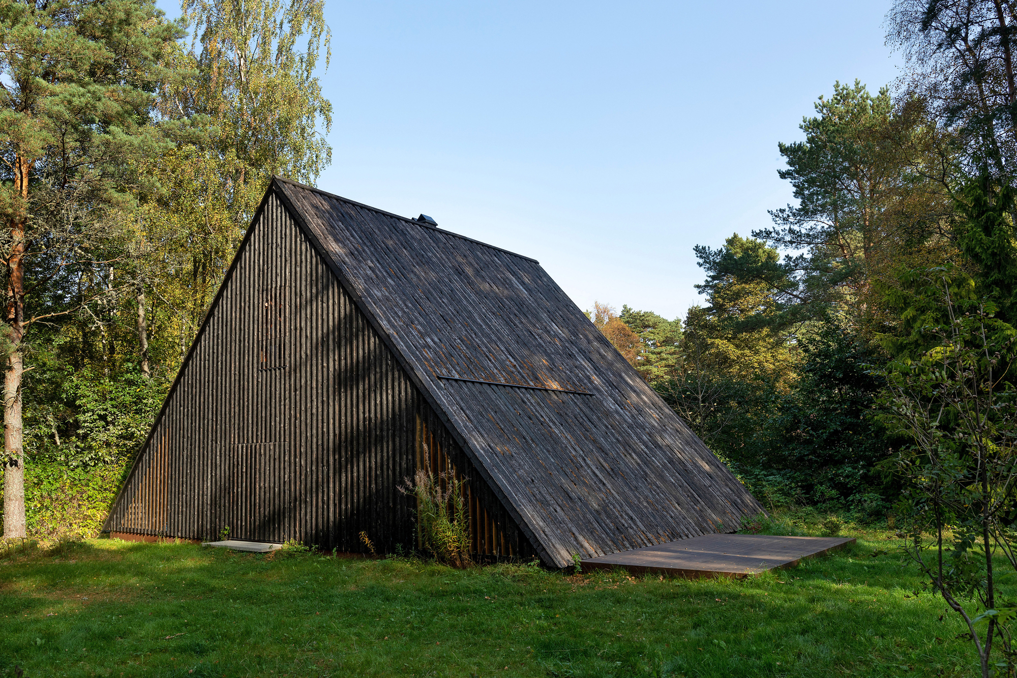 Když majitelé zavřou veškeré okenní otvory, téměř si chaty uprostřed přírody nevšimnete. Její interiér přitom není nijak skromný a nabízí jejím obyvatelům skutečné pohodlí přitom v úzkém kontaktu s přírodou. Letní dům ve Vääna-Jõesuu se nachází asi 35 km od Tallinnu. Architekti ze studia Arhitektuuribüroo Eek & Mutso při návrhu vycházeli z tvaru klasické áčkovky. Minimalistická forma připomínající stan týpí, která se často stavěla především v 70. letech 20. století, byla doplněná o kinetické prvky, které během chvilky promění lakonicky vyznívající objem v současný vzdušný letní domek. Pokud není chata zrovna využívaná, znovu se uzavře a zůstává zcela nedostupná a snadno přehlédnutelná. Dřevěná fasáda je opatřena povrchovou úpravou yakisugi. Jedná se o tradiční japonský postup, kdy jsou vnější prkna opálená a tím jsou chráněna proti vnějším vlivům. Dům tak splývá s okolními kmeny borovic.