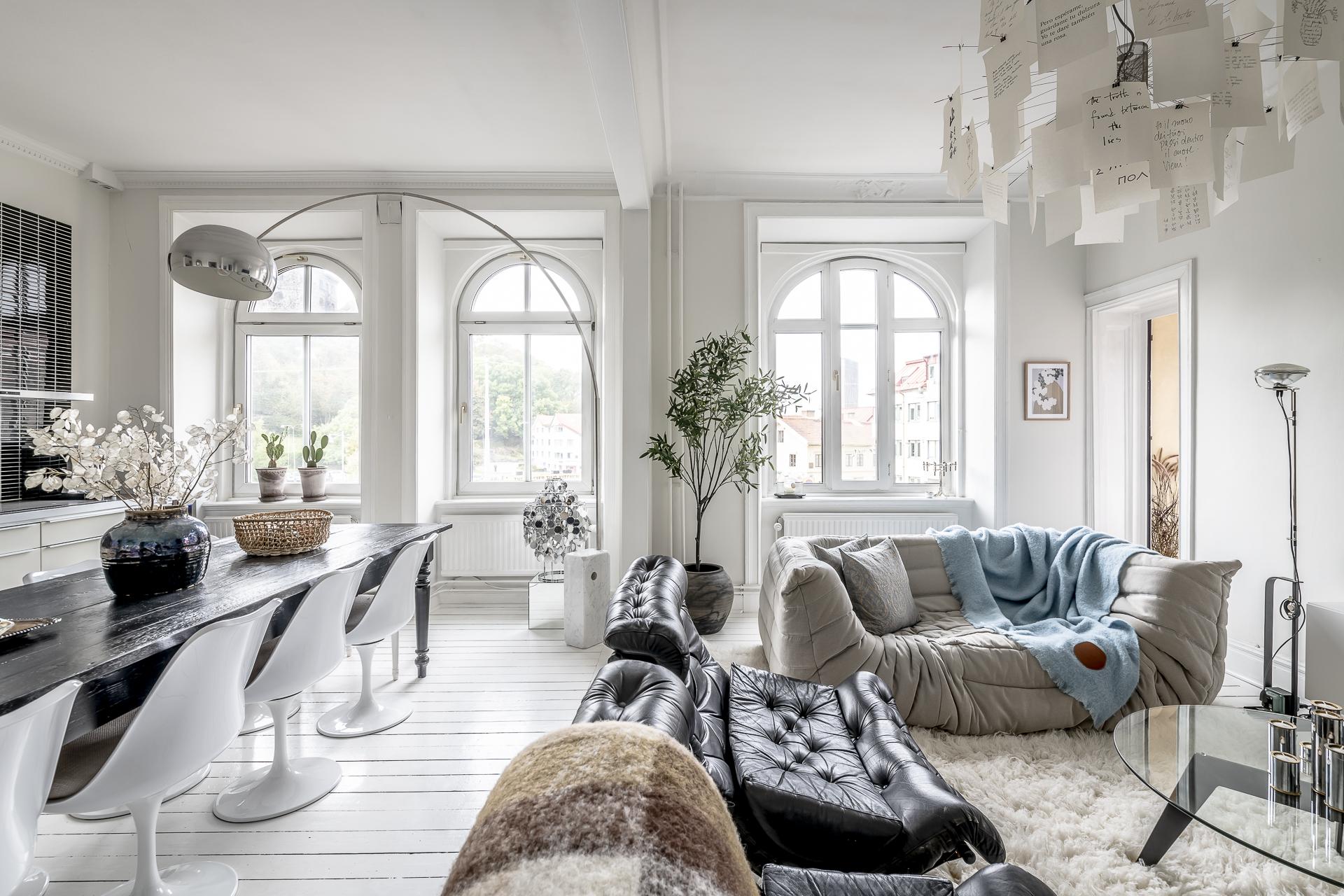 Jen málo míst ve švédském Göteborgu je spojeno s historií tak silně jako oblast Skanstorget, kde se právě nacházíme. Kořeny této čtvrti sahají až do 17. století a dohlíží na ni kamenná pevnost Skansen Kronan. Právě na tuto kulturní památku mají majitelé výhled z oken svého devadesátimetrového bytu. Klenutá okna obývacího pokoje, kuchyně a jídelny vedou na rušnější stranu, zatímco další do dvou světových stran a do klidného vnitrobloku. Interiér je plný dobových detailů z konce minulého století. Nechybí dva balkony, vysoké štukované stropy, původní prkenné podlahy opatřené bílým voskem a dvoje kachlová kamna.