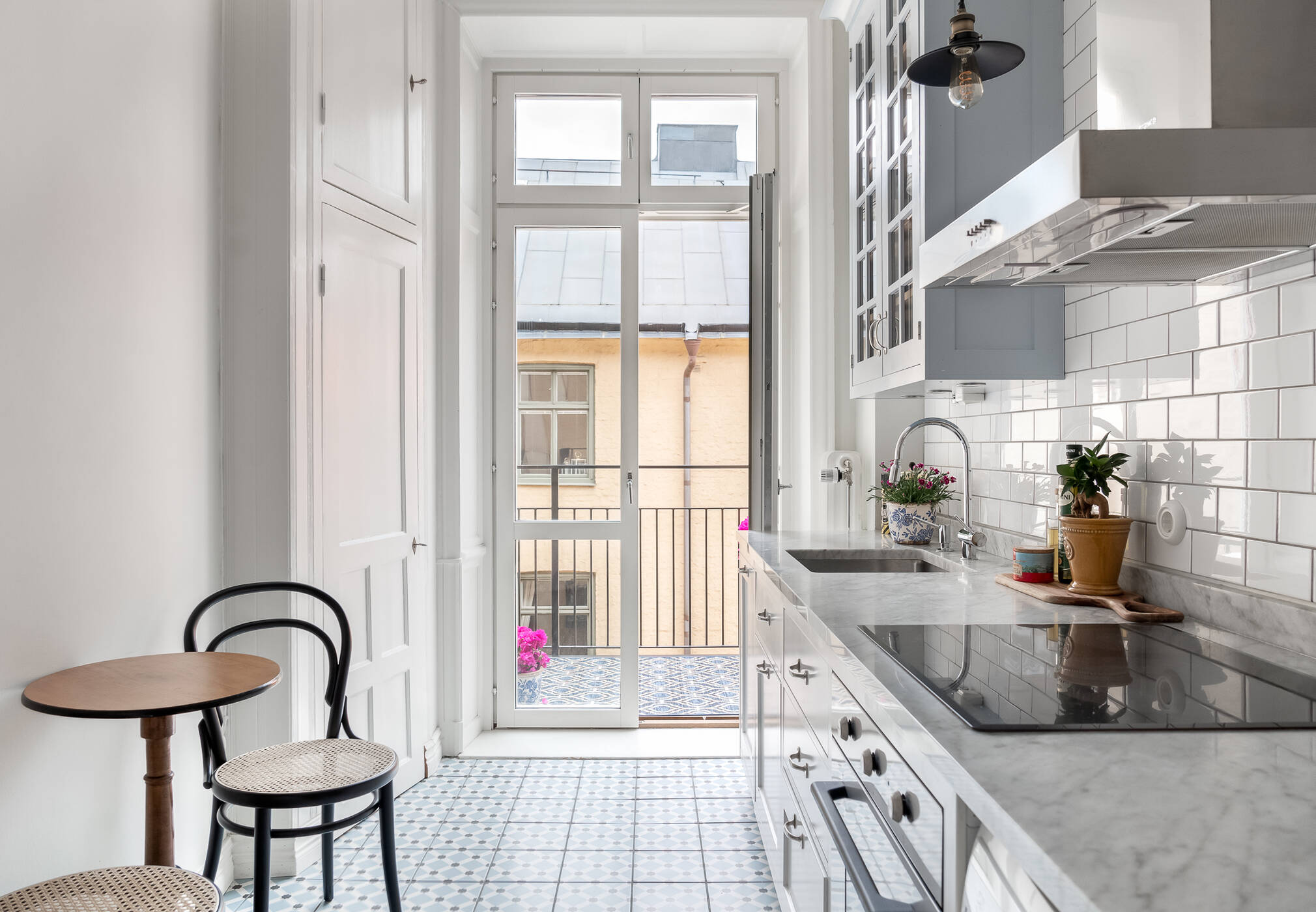 Stylový je už samotný příchod do bytu. Světlou halu zdobí zlaté secesní zrcadlo, nechybí praktické věšáky. Odtud můžete vejít do samostatné nevelké kuchyně, ze které vedou dvoukřídlé dveře na kouzelný balkon orientovaný na jižní stranu do klidného vnitrobloku. Rohová špíz poskytuje potřebné úložné místo. Protože by větší jídelní stůl zabíral zbytečné místo, je zde pouze kávový stolek s ikonickými židlemi značky Ton. Elegantní kuchyňská linka byla vyrobená v Himleköku a je opatřena pracovní deskou z carrarského mramoru. Stejný materiál najdeme také v koupelně. Obývací pokoj je stylový a svou atmosférou připomíná dobu konce 19. století. Několik vkusně vybraných dekorací odkazuje na současný skandinávský design zdůrazňující minimalismus a čisté linie. Vedle pokoje je další místnost, která je zařízená jako světlá kancelář. S hlavní ložnicí sousedí dvě prostorné šatny, a tak v samotné ložnici nebylo potřeba řešit úložný nábytek. Není tu proto nic jiného než pohodlná postel, noční stolky a křeslo.