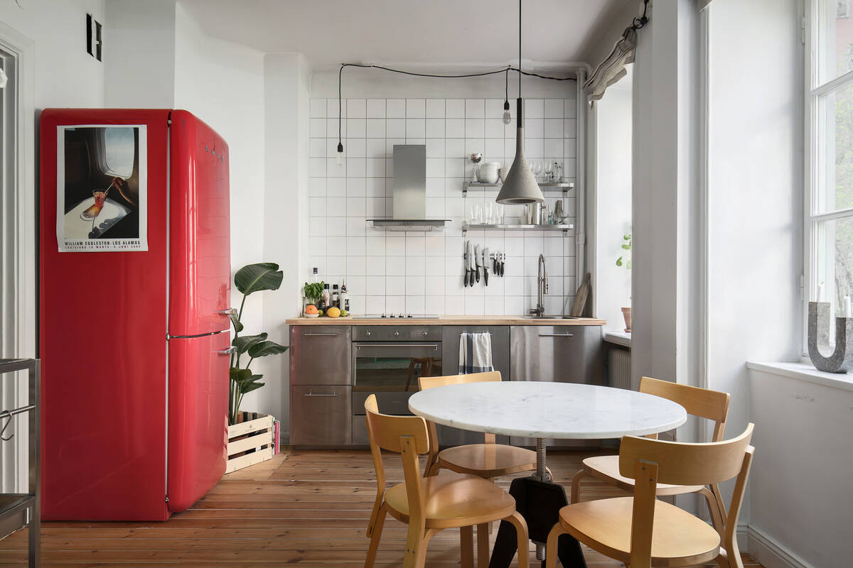 Ve švédském Stockholmu na rohu ulice Bråvallagatan stojí dům z dvacátých let. Ve čtvrti plné barevných domů a rozkvetlých předzahrádek je ideálním místem, které v sobě snoubí kvalitu života ve velkoměstě s harmonickým klidným bydlením. Čtyřicetimetrový byt má otevřeným půdorys, který se díky třem velkým oknům doslova koupe v denním světle. Z dob vzniku domu se podařilo dochovat řadu stavebních detailů, které pomáhají utvářet tu pravou atmosféru. Jsou to především původní dřevěné podlahy, vysoké stropy a sloupková okna. Při příchodu do bytu vás uvítá prostorná hala s dřevěnou masivní podlahou a bílými stěnami. Vestavěné skříně poskytují dostatek úložného prostoru, místo zde našel i psací stůl. Hlavní obytná místnost v sobě spojuje kuchyň, jídelnu a obývací pokoj. Nově renovovaná kuchyňská část je v moderním jednoduchém stylu. Nerezové skříňky rámuje dřevěná pracovní deska. Kvůli zachování vzdušnosti se obešla bez horních skříněk, které nahrazují dvě nerezové police. Dominantou a kontrapunktem k jinak střízlivým barvám je červená retro lednice.