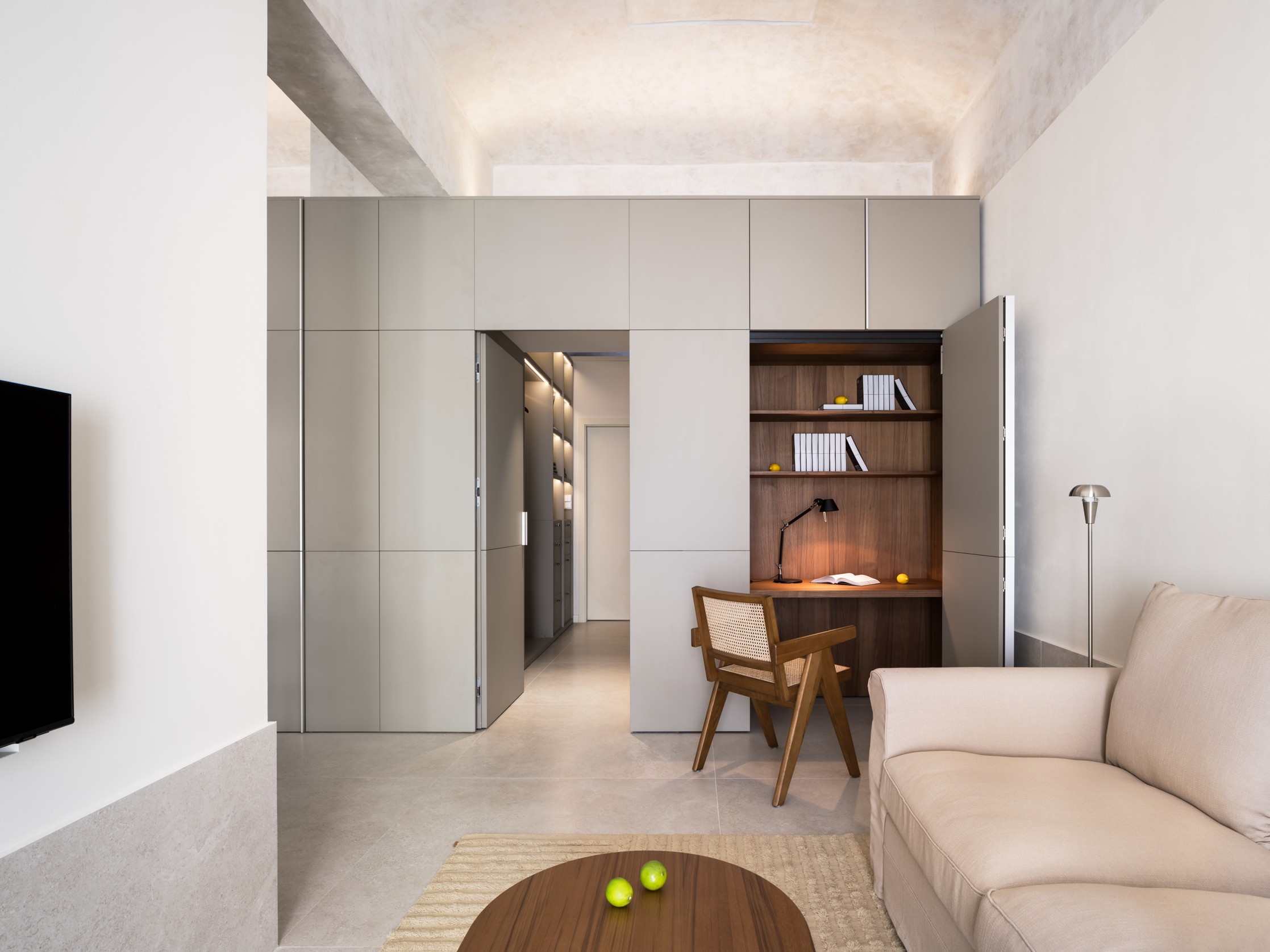 Denní část bytu s velkolepou kuchyní, obývacím pokojem a pracovnou, která je skrytá ve skříni, uvidíte na první pohled. Do ložnice se šatnou a koupelnou, se dostanete skrze skryté dveře, které zprvu vypadají jako součást dřevěného obložení. „Kromě efektivního vytěžení snad každého centimetru, stojí za zmínku autorský design architekta v podobě zámečnických a truhlářských prvků, které se svým zpracováním rovnají uměleckému dílu. To krásně prezentuje kovová vitrína s vroubkovaným sklem, která z chodby zastane funkci šatní skříně a z části kuchyně reprezentativního příborníku. Do prostoru kuchyně propouští denní světlo a díky LED podsvícení může zářit jako lucerna. Historizující šmrnc bytu propůjčují ručně patinované malby, nebo velkoformátová dlažba v přírodních béžových tónech, která se v podobě vysokých soklů stala signifikantním prvkem této realizace,“ uzavírají.