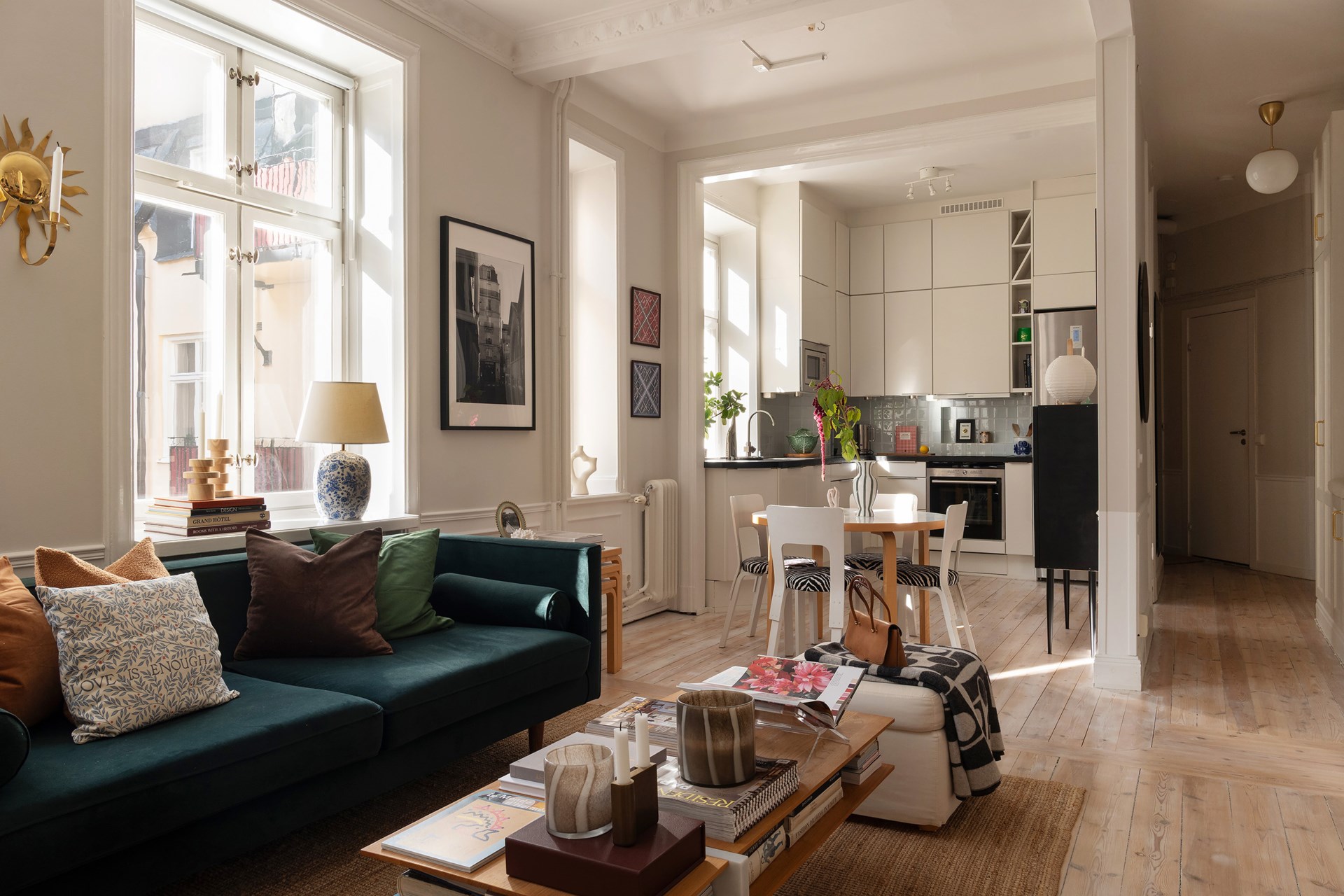 Ložnice, oddělená prosklenými dveřmi, působí jako útočiště klidu. Na balkon s odpoledním sluncem se vstupuje přímo z postele, což vybízí k ranní kávě i k večernímu odpočinku v měkkém světle západu. Dům se nachází v srdci čtvrti Kungsholmen, jen pár kroků od kaváren, obchodů a nábřeží Norr Mälarstrand. Přestože se byt nachází v samém centru města, na dvoře vládne překvapivý klid a pocit soukromí. Kombinace historie, kvalitního řemesla a příjemné atmosféry dělá z tohoto bytu výjimečné místo - přesně takové, kde se minulost potkává s přítomností v tom nejlepším slova smyslu.
